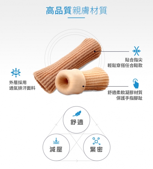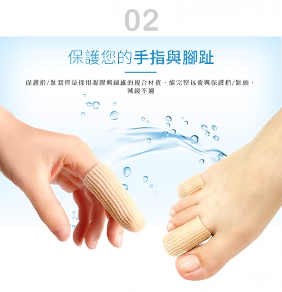 - 保護套內批覆柔軟的凝膠,能幫助手指/腳趾因摩擦與壓迫所造成的不適。