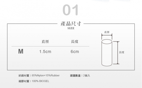 紡織材質 :85%尼龍、 15%橡膠,凝膠材質 :100% BIOGEL