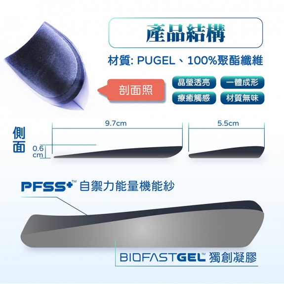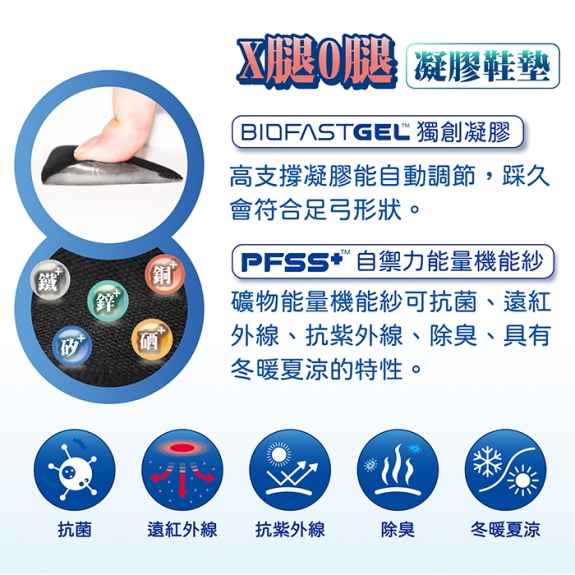 特點 X腿O腿矯正鞋墊為「PFSS+能量機能紗」複合「BIOFASTGEL凝膠」的組成。