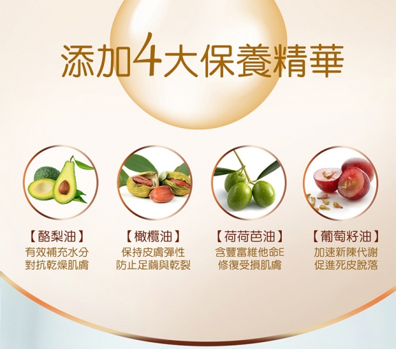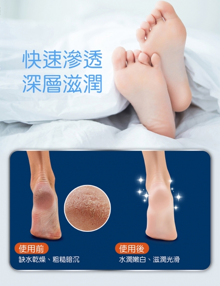 - 預防皮膚乾燥發癢,滋潤乾燥粗糙的腳跟、軟化粗糙角質。