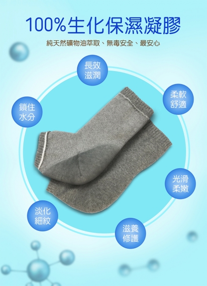 紡織材質:84%棉+16%彈性纖維; 凝膠材質:100% BIOGEL;成分:荷荷芭油、酪梨油、橄欖油、葡萄籽油