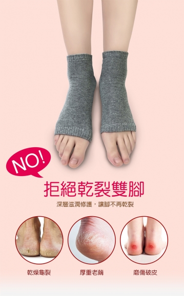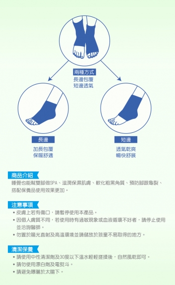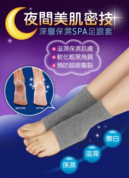 - 深層保濕SPA足跟套在睡覺時穿著可滋潤足跟皮膚,防止乾燥和龜裂。