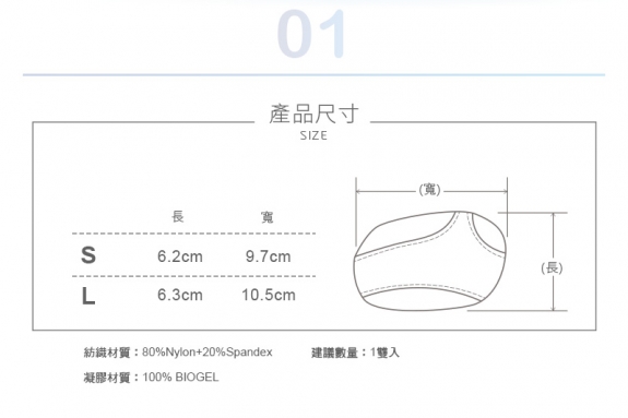 紡織材質 80%尼龍、20%彈性纖維;凝膠材質 100% BIOGEL