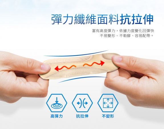 - 外層採用舒適柔軟高彈性布料並添加抗菌成份。