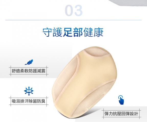 - 內包覆高吸震減壓柔軟凝膠,能舒緩前腳掌蹠骨因摩擦與壓迫所造成的不適。