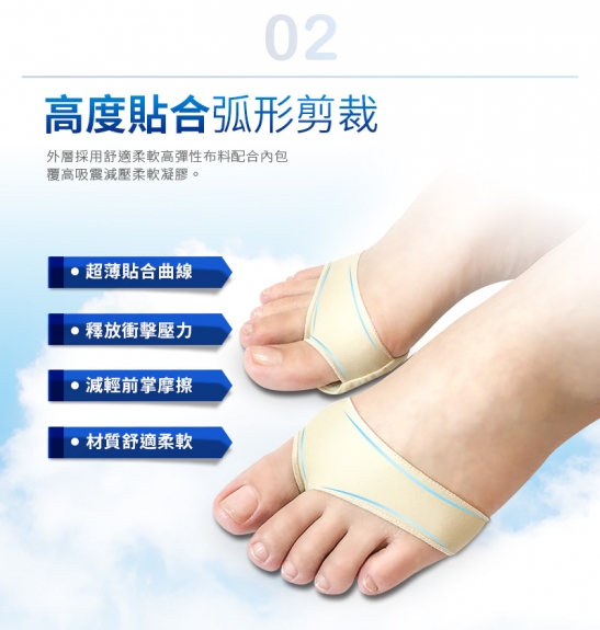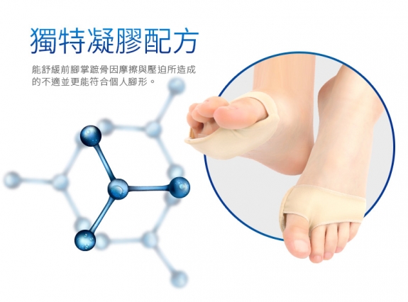 2.本產品內包覆高吸震減壓柔軟凝膠,能舒緩前腳掌蹠骨因摩擦與壓迫所造成的不適,舒緩疼痛。