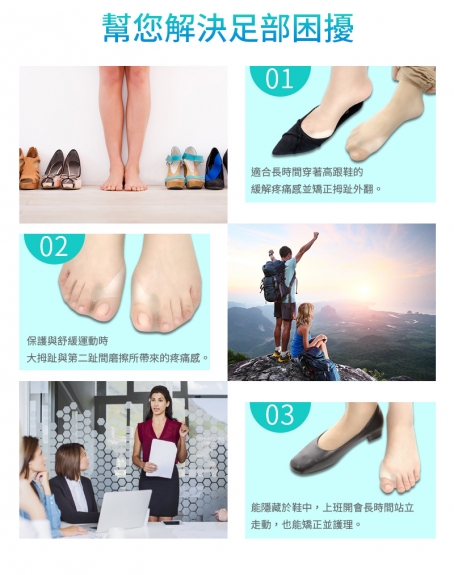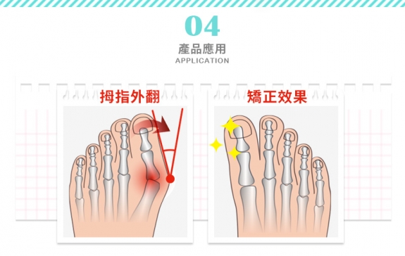 3.有效伸展及分開交疊的腳趾,減緩拇趾外翻處的壓力及摩擦,適用各型鞋款。